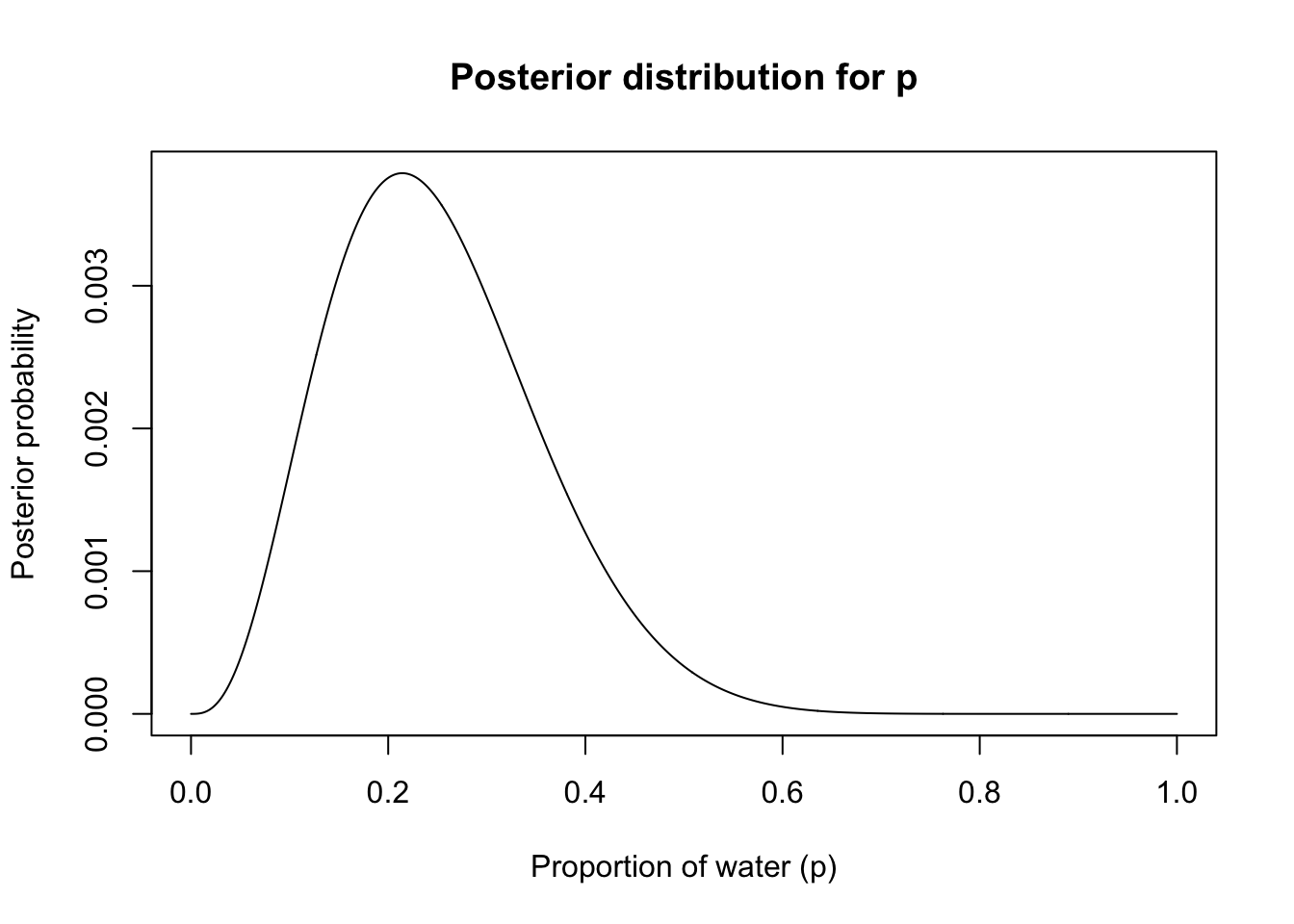 The posterior distribution shows the probability of different values of p (proportion of water) given our data (3 water, 11 land). Since we used a uniform prior, the posterior is proportional to the likelihood. The peak of the distribution is around p = 0.21, which makes sense given our data (3/14 ≈ 0.21).