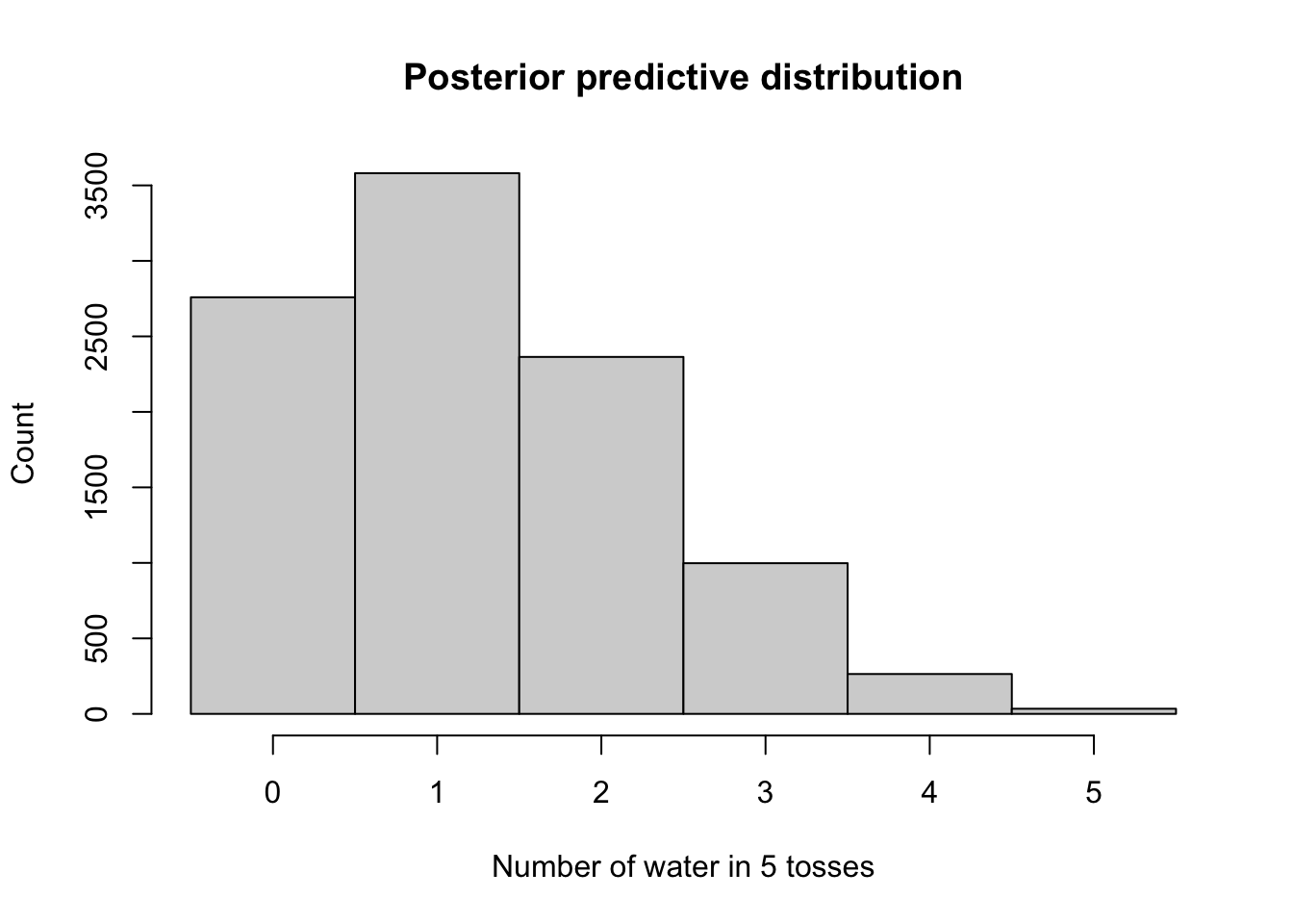 # Number of samples from posteriorn_samples <-10000# Sample p values from posteriorp_samples <-sample(p_grid, prob = posterior, size = n_samples, replace =TRUE)# Generate predictions for 5 tossesn_tosses <-5predictions <-rbinom(n_samples, size = n_tosses, prob = p_samples)# Plot the posterior predictive distributionhist(predictions, xlab ="Number of water in 5 tosses",ylab ="Count",main ="Posterior predictive distribution",breaks =seq(-0.5, 5.5, by =1))