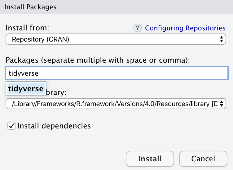 Notice also that RStudio will generate a line of code for you and run it: install.packages("tidyverse")
